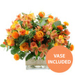 Our Autumn Bliss bouquet offers a captivating mix of orange roses, orange alstroemeria, carthamus, and eucalyptus, creating a stunning homage to an autumn sunrise. Perfect for adding warmth and color to any space or as a heartfelt gift.