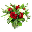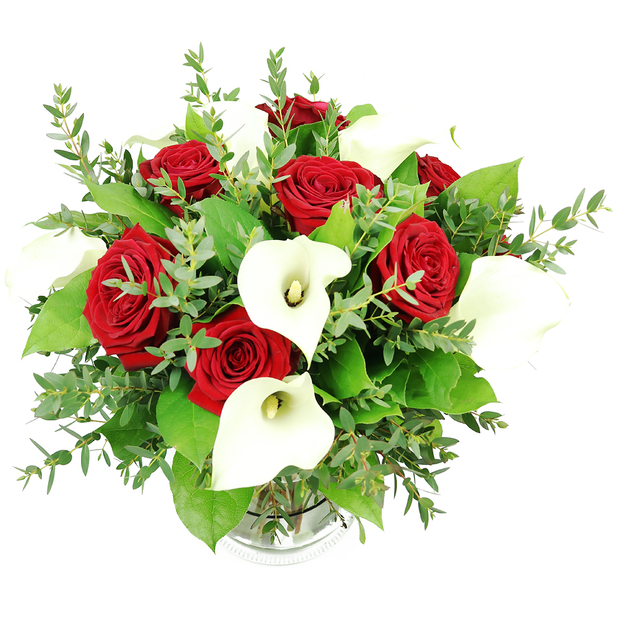 Celebrate special moments with our captivating bouquet, showcasing vivid red roses, pristine white calla lilies, rich ruscus, and vibrant greenery. Each blossom is carefully chosen to ensure exceptional freshness and quality.