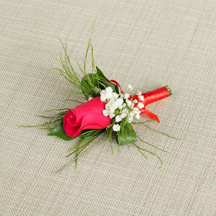 A gorgeous groom buttonhole made of red rose, gypsophila and aralia leaves, finished with small satin red ribbon. It's a perfect complement to every wedding suit!